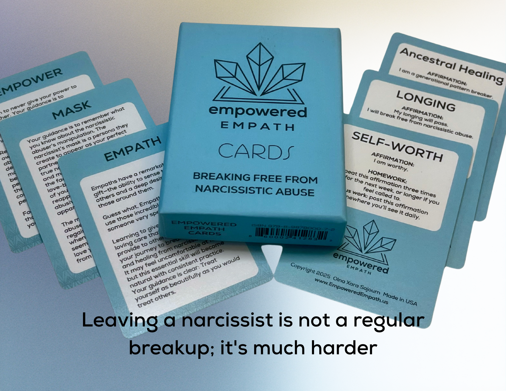 A Card Deck like no other, it is for the person who is struggling to break free from the narcissist in their life. These are not regular breakups; they're much harder.